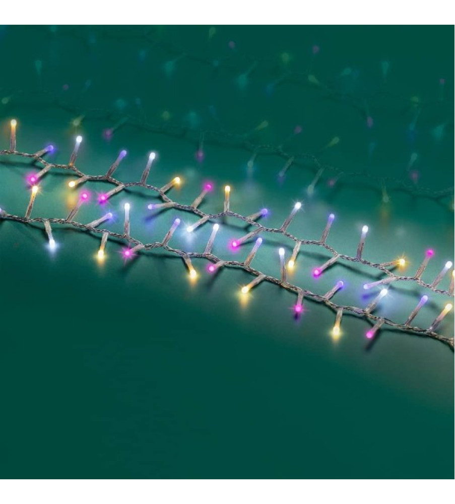 STRING LIGHT WITH 8 FLASHING EFFECT FUNCTIONS INCLUDING FIXED MODE 500 MULTICOLOR LEDS 220 - 240 V 50/60 Hz FOR INDOOR AND OUTDOOR IP44 TRANSPARENT CABLE POWER CABLE 5 m DISTANCE BETWEEN THE FIRST AND LAST BULB 11 m TOTAL LENGTH 16 m TIMER 8 h ON / 16 h OFF
