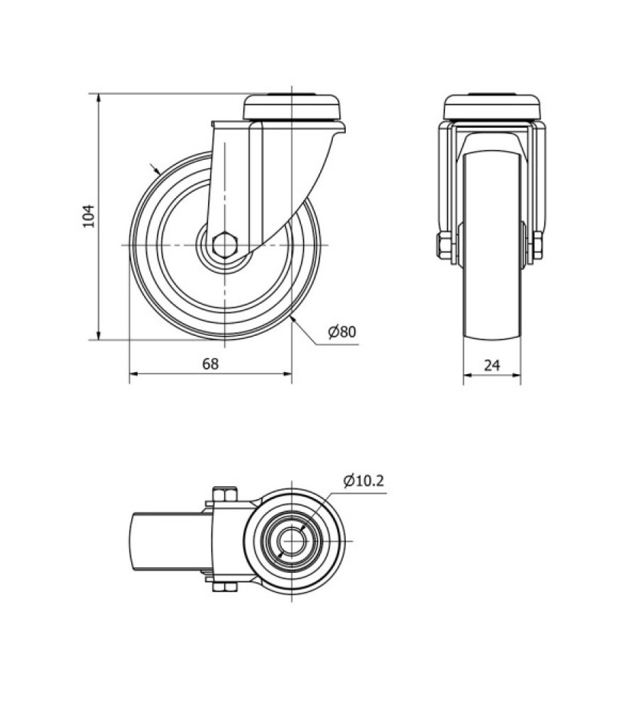 RUBBER SWIVEL CASTER 60KG 80MM HOLE 10MM