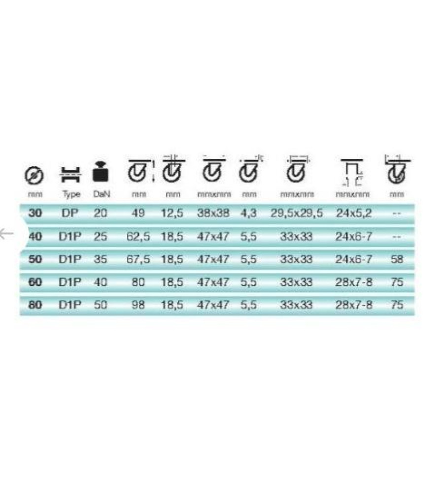 Swivel press steel zinc plated housing with plate fitting. Wheel Diameter 40mm Allowed Weight Per Wheel : 25kg Plate size : 48x47mm Height floor to plate: 62.5mm Drilling hole diameter: 5.5mm Hole distance: 33x33mm