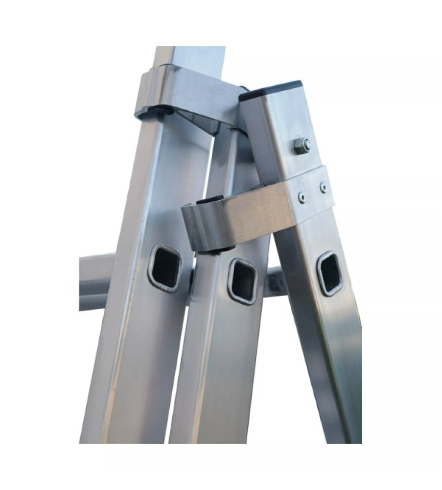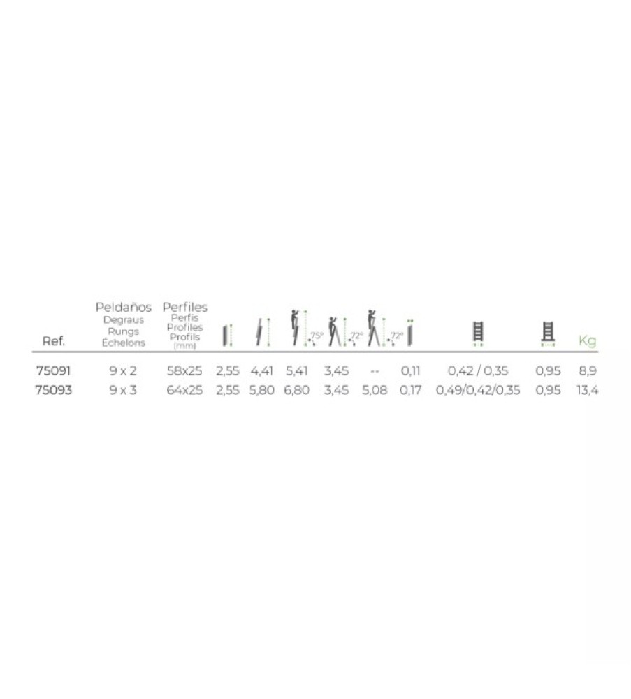 TRANSFORMABLE ALUMINUM LADDER 3 x 9 STEPS. FOLDED MEASUREMENTS: 49 x19 x 255 cm. HEIGHT OF THE LAST STEP 5.80m. LADDER WEIGHT: 13.4 kg. MAXIMUM WEIGHT: 150 kg. 6.04 m MAXIMUM LENGTH IN USE SECURITY LOCKING SYSTEM ALUMINUM SLIDE GUIDES STABILIZING BASE AND NYLON SAFETY TAPE. EN131