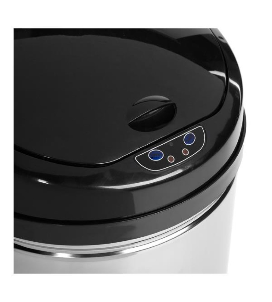 BIN WITH AUTOMATIC OPENING SENSOR. USES 4xLR20 BATTERIES (NOT INCLUDED) SIZE: Ø30x77cm (diameter/height) ALPHA MODEL SILVER/BLACK COLOR. MATERIAL: STAINLESS STEEL. 42 LITERS