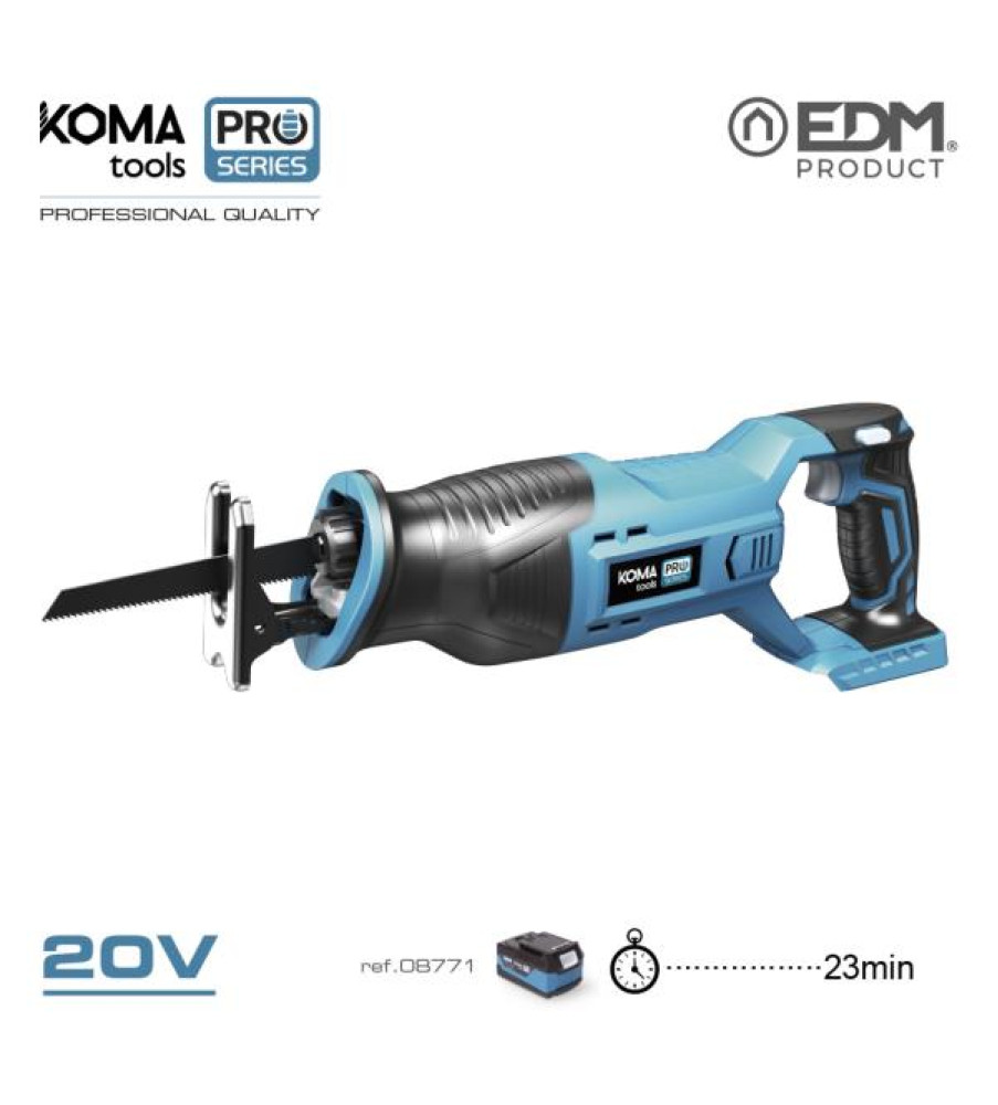 20V LI-ION SABER SAW (WITHOUT BATTERY AND CHARGER). STROKE LENGTH: 24.4mm. COMFORTABLE NON-SLIP GRIP. NO LOAD SPEED FROM 0 TO 2800rpm. ADJUSTABLE POWER. QUICK KEYLESS BLADE CHANGE. COMPATIBLE WITH 4A/5A 08771/08774 BATTERY. DIMENSIONS: 8.5x44x15.5cm (width/depth/height)