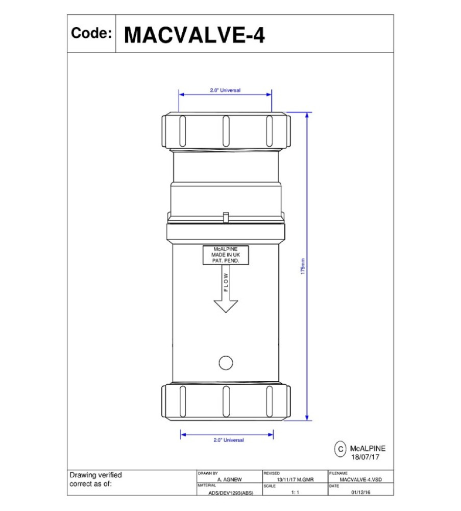 Great for fitting horizontally or vertically. Perfect to stop smells and backflow. With no water seal it can never dry out through evaporation or lack of use as the membrane remains sealed. Can be fitted in the horizontal or vertical position The Internal Membrane opens under water pressure to allow the discharge to flow freely and then closes to form a seal to prevent foul odour or sewer gas entering the building. 2? x 2? Universal Compression Connections The Non-Return Valve shall prevent problems with waste backflow or back pressure in the discharge pipe system. Easily removed for maintenance of the discharge pipework Before installation test that the membrane is opening and closing