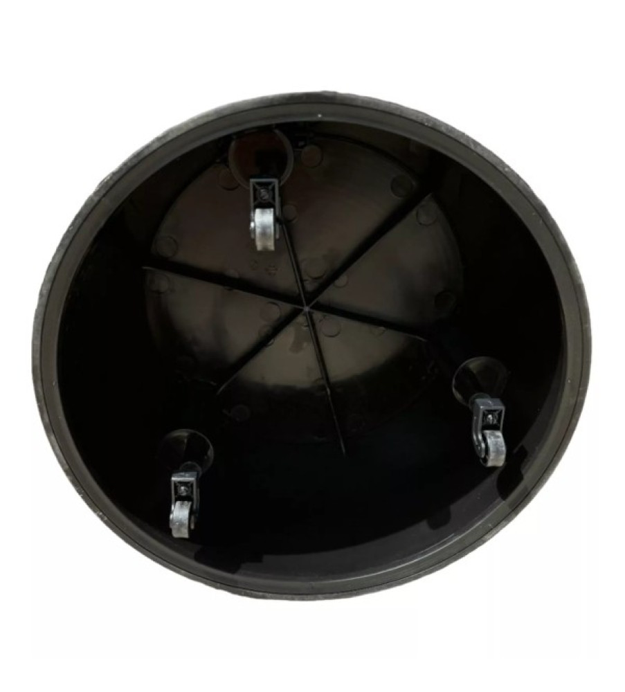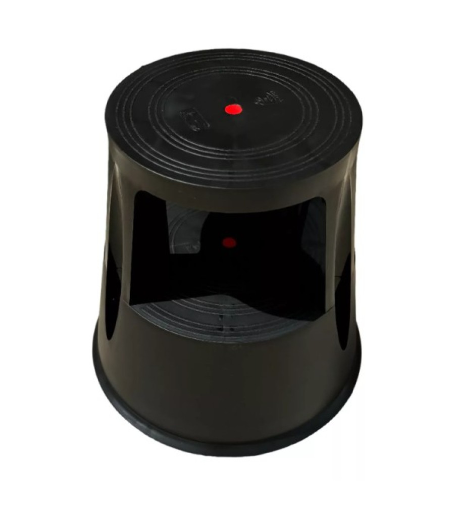 BLACK MOBILE STABLE STOOL MADE OF PLASTIC AND WITH 3 WHEELS AT THE BOTTOM THAT ALLOW IT TO BE MOVED AND ATTACHED TO THE FLOOR. STRONG COMPACT AND LIGHTWEIGHT IT SUPPORTS UP TO 150kg OF MAXIMUM WEIGHT. MAXIMUM HEIGHT 42cm UPPER DIAMETER 28.5cm BASE DIAMETER 43.5cm IT HAS A PERIMETER RUBBER ON ITS BASE THAT PREVENTS SLIDING AND HITS AGAINST FURNITURE.